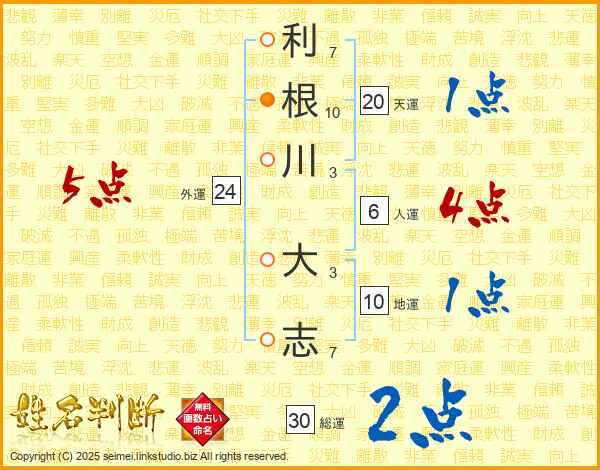 利(7画)根(10画)川(3画) 大(3画)志(7画)
