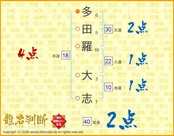 多(6画)田(5画)羅(19画) 大(3画)志(7画)