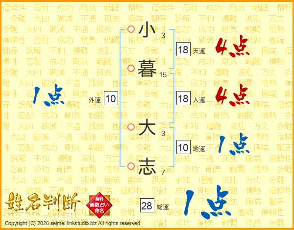 あなたの人生を表す1番重要な運勢です。生涯を通じて影響する総合運となり、主に50歳以降の晩年期に影響を及ぼします。苗字と名前の合計画数。