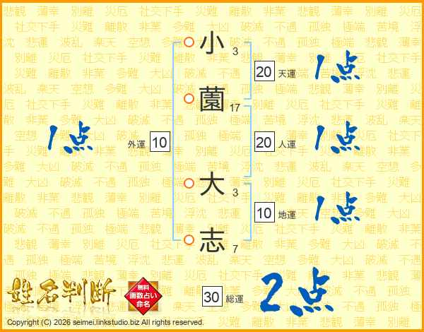 生活面を象徴する運勢です。外部から受ける影響力を表し、結婚運、家庭運や職場、環境への順応性を表します。総運から人運を引いた画数。姓や名が1文字の場合を除く。