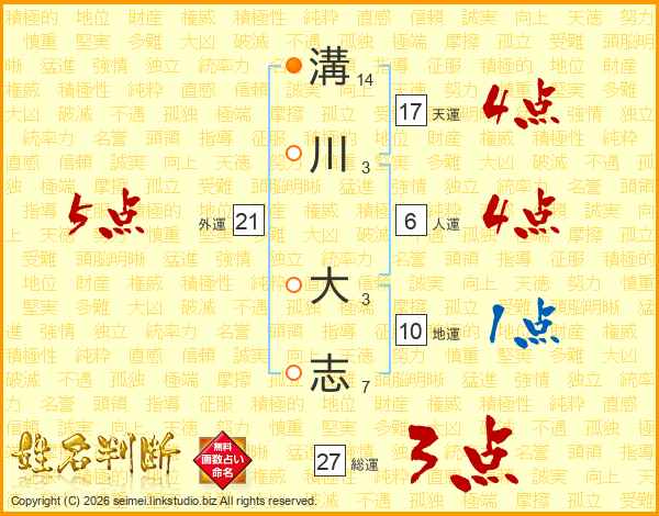 生活面を象徴する運勢です。外部から受ける影響力を表し、結婚運、家庭運や職場、環境への順応性を表します。総運から人運を引いた画数。姓や名が1文字の場合を除く。