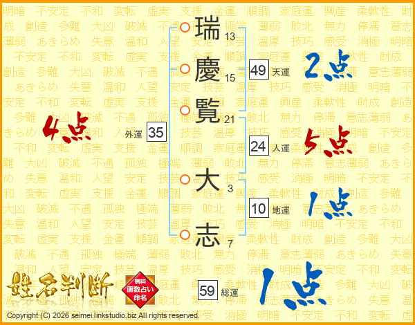瑞(13画)慶(15画)覧(21画) 大(3画)志(7画)