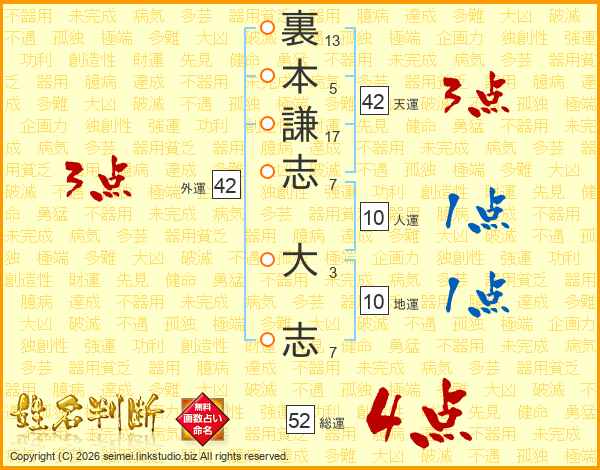 裏(13画)本(5画)謙(17画)志(7画) 大(3画)志(7画)