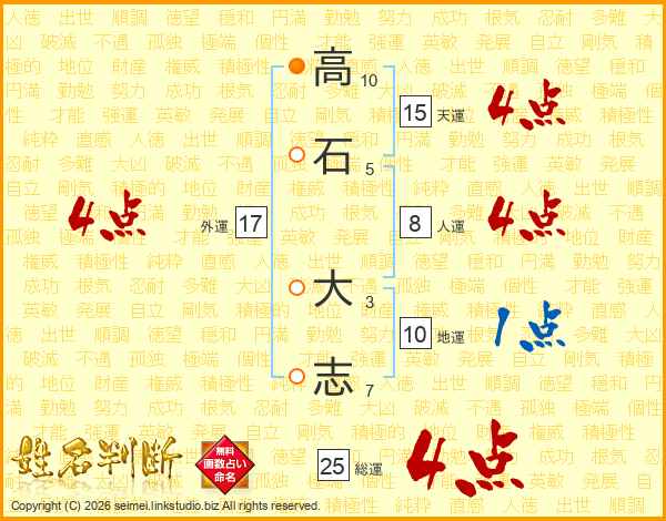 生活面を象徴する運勢です。外部から受ける影響力を表し、結婚運、家庭運や職場、環境への順応性を表します。総運から人運を引いた画数。姓や名が1文字の場合を除く。
