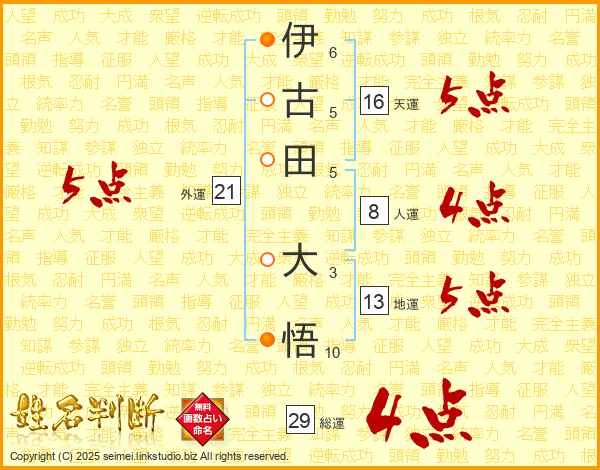 伊(6画)古(5画)田(5画) 大(3画)悟(10画)