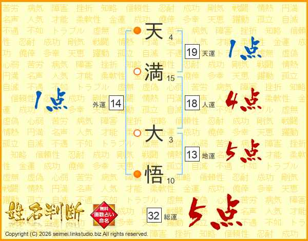 あなたの人生を表す1番重要な運勢です。生涯を通じて影響する総合運となり、主に50歳以降の晩年期に影響を及ぼします。苗字と名前の合計画数。