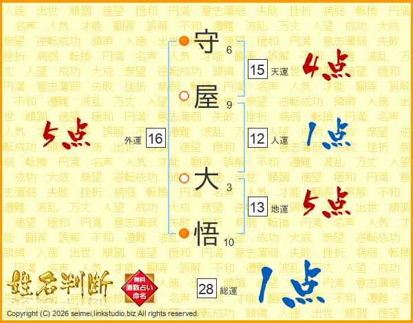 守(6画)屋(9画) 大(3画)悟(10画)