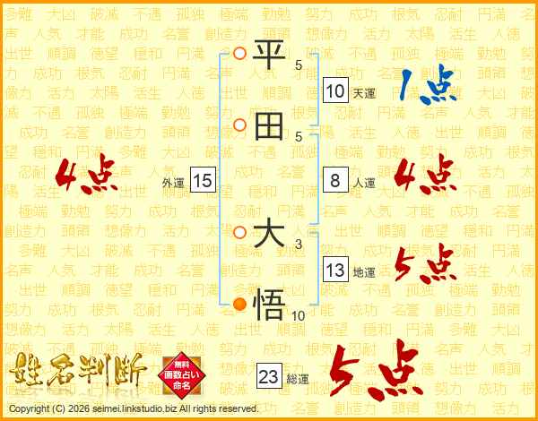 平(5画)田(5画) 大(3画)悟(10画)