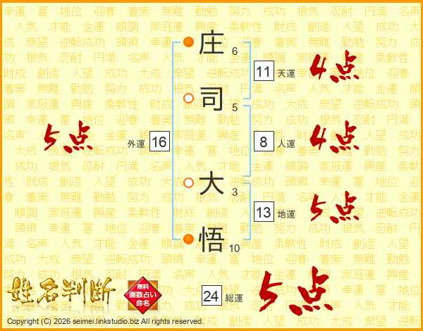 庄(6画)司(5画) 大(3画)悟(10画)