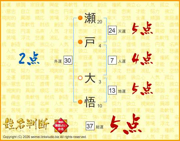 瀬戸大悟さんの総運は37画の5点!