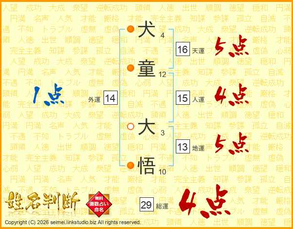犬(4画)童(12画) 大(3画)悟(10画)