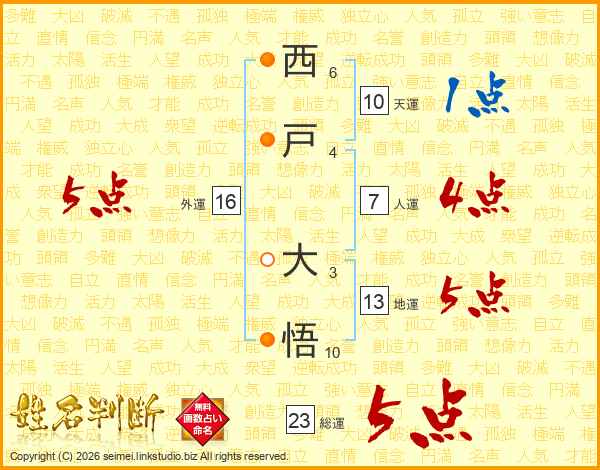 あなたの人生を表す1番重要な運勢です。生涯を通じて影響する総合運となり、主に50歳以降の晩年期に影響を及ぼします。苗字と名前の合計画数。
