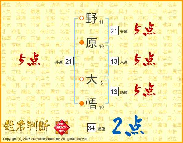 野原大悟さんの人運は13画の5点!