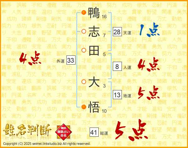 鴨(16画)志(7画)田(5画) 大(3画)悟(10画)