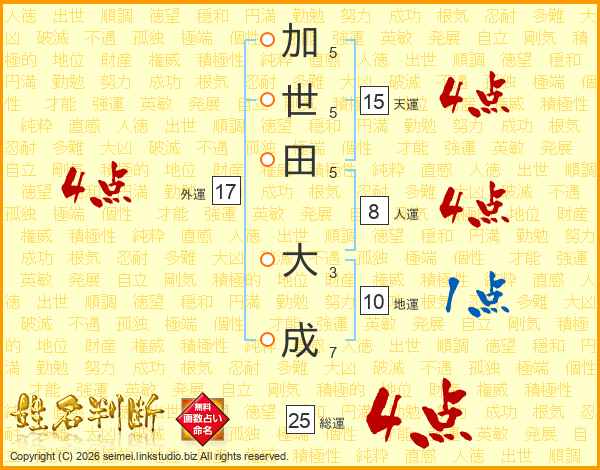 加世田大成さんの総運は25画の4点!