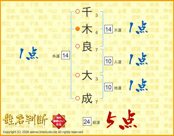 千(3画)木(4画)良(7画) 大(3画)成(7画)