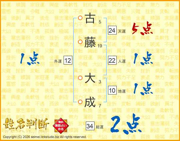あなたの人生を表す1番重要な運勢です。生涯を通じて影響する総合運となり、主に50歳以降の晩年期に影響を及ぼします。苗字と名前の合計画数。