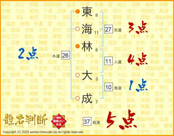 東(8画)海(11画)林(8画) 大(3画)成(7画)