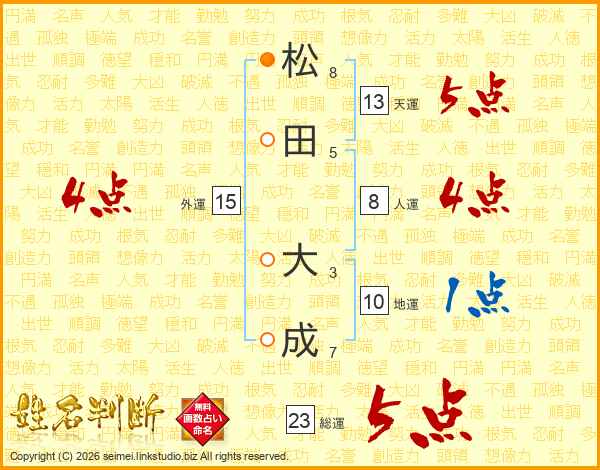 あなたの人生を表す1番重要な運勢です。生涯を通じて影響する総合運となり、主に50歳以降の晩年期に影響を及ぼします。苗字と名前の合計画数。