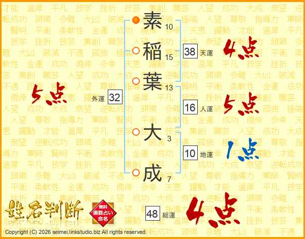素(10画)稲(15画)葉(13画) 大(3画)成(7画)
