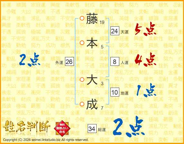 あなたの人生を表す1番重要な運勢です。生涯を通じて影響する総合運となり、主に50歳以降の晩年期に影響を及ぼします。苗字と名前の合計画数。
