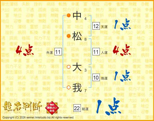 あなたの人生を表す1番重要な運勢です。生涯を通じて影響する総合運となり、主に50歳以降の晩年期に影響を及ぼします。苗字と名前の合計画数。