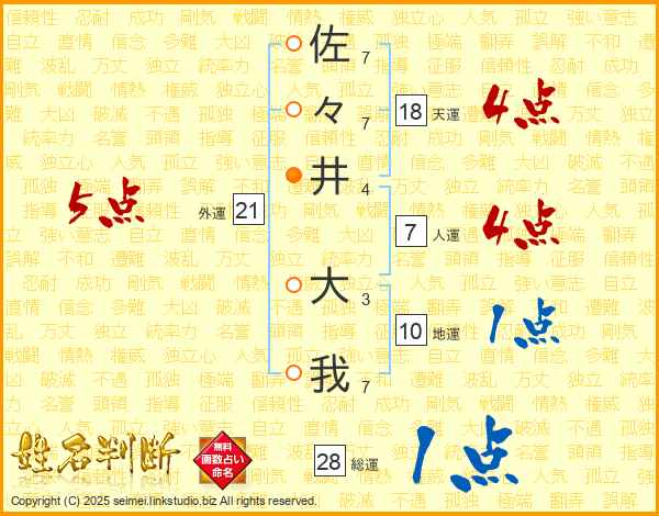 佐(7画)々(7画)井(4画) 大(3画)我(7画)