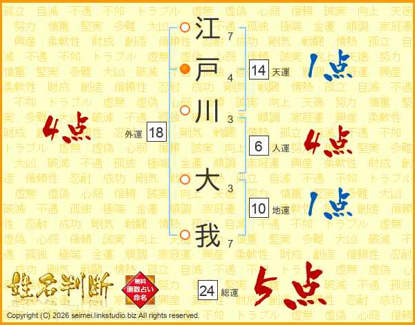 生活面を象徴する運勢です。外部から受ける影響力を表し、結婚運、家庭運や職場、環境への順応性を表します。総運から人運を引いた画数。姓や名が1文字の場合を除く。