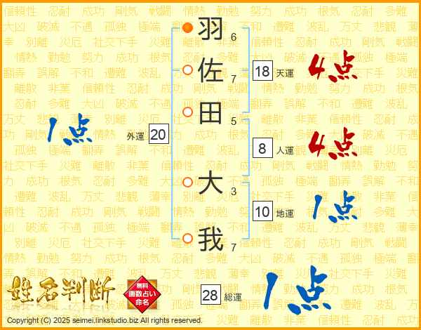 羽(6画)佐(7画)田(5画) 大(3画)我(7画)