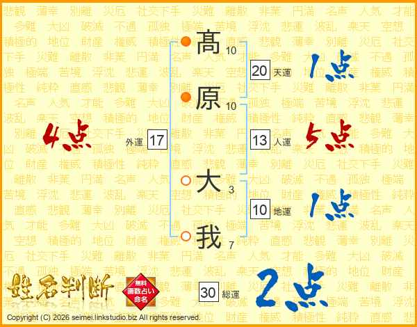 生活面を象徴する運勢です。外部から受ける影響力を表し、結婚運、家庭運や職場、環境への順応性を表します。総運から人運を引いた画数。姓や名が1文字の場合を除く。