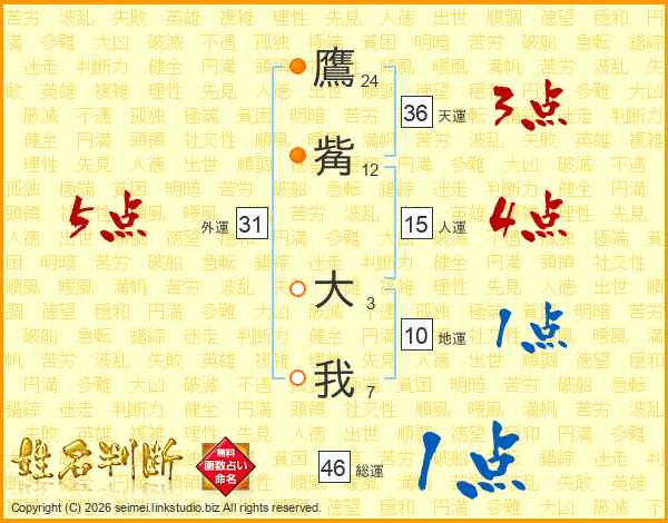 生活面を象徴する運勢です。外部から受ける影響力を表し、結婚運、家庭運や職場、環境への順応性を表します。総運から人運を引いた画数。姓や名が1文字の場合を除く。