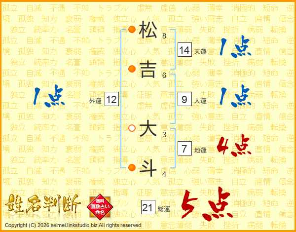 生活面を象徴する運勢です。外部から受ける影響力を表し、結婚運、家庭運や職場、環境への順応性を表します。総運から人運を引いた画数。姓や名が1文字の場合を除く。