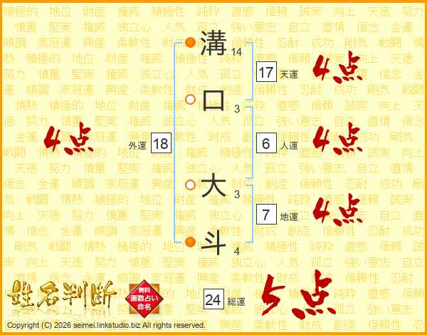 家系が持つ宿命的な運勢を表します。祖先から受け継いだ苗字ですので自分の力が及びません。家柄を象徴します。苗字の合計画数。