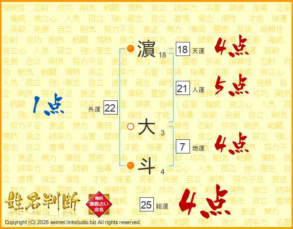 家系が持つ宿命的な運勢を表します。祖先から受け継いだ苗字ですので自分の力が及びません。家柄を象徴します。苗字の合計画数。