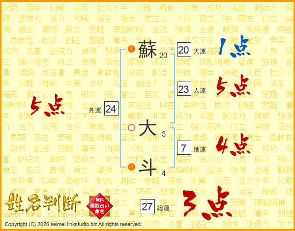 生活面を象徴する運勢です。外部から受ける影響力を表し、結婚運、家庭運や職場、環境への順応性を表します。総運から人運を引いた画数。姓や名が1文字の場合を除く。