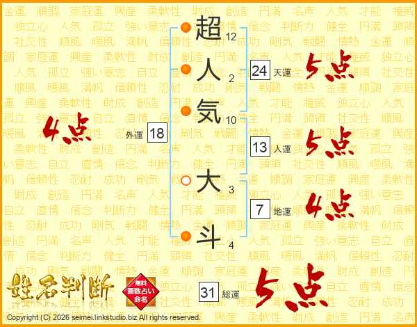超人気大斗さんの総運は31画の5点!