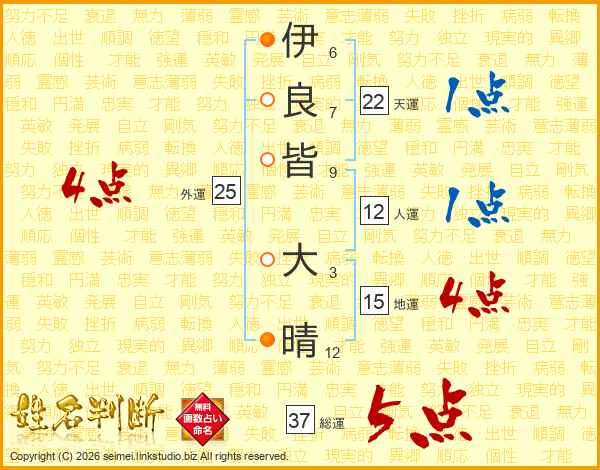 伊(6画)良(7画)皆(9画) 大(3画)晴(12画)