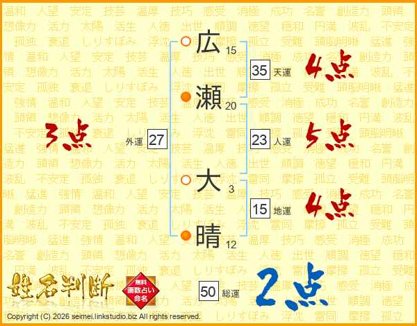 広(15画)瀬(20画) 大(3画)晴(12画)