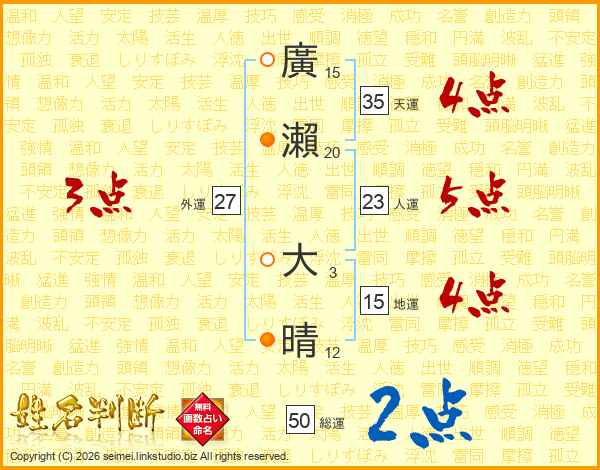 廣(15画)瀨(20画) 大(3画)晴(12画)