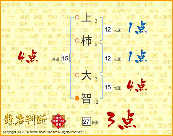 上(3画)柿(9画) 大(3画)智(12画)