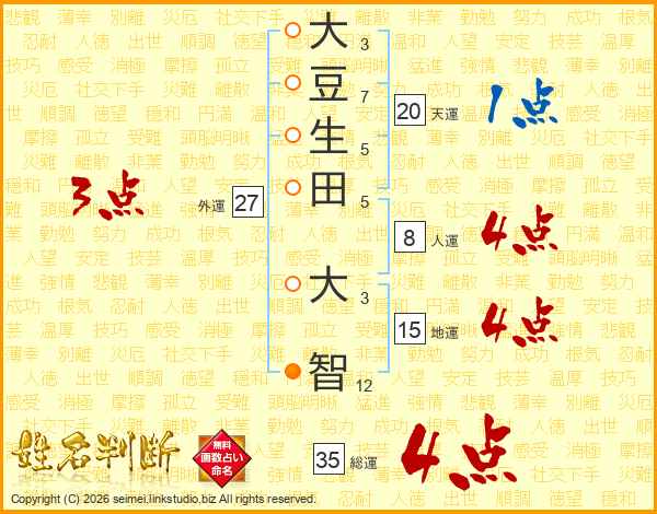 大(3画)豆(7画)生(5画)田(5画) 大(3画)智(12画)