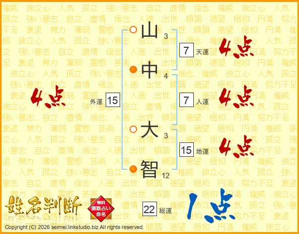あなたの人生を表す1番重要な運勢です。生涯を通じて影響する総合運となり、主に50歳以降の晩年期に影響を及ぼします。苗字と名前の合計画数。