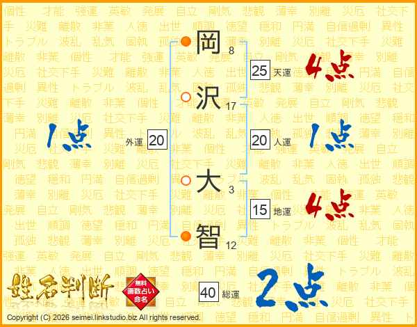 生活面を象徴する運勢です。外部から受ける影響力を表し、結婚運、家庭運や職場、環境への順応性を表します。総運から人運を引いた画数。姓や名が1文字の場合を除く。