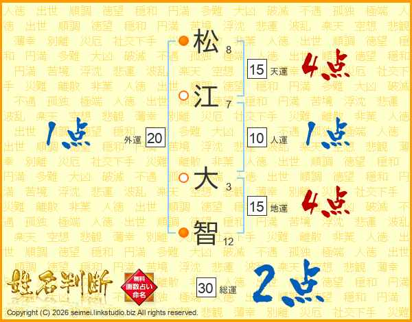 生活面を象徴する運勢です。外部から受ける影響力を表し、結婚運、家庭運や職場、環境への順応性を表します。総運から人運を引いた画数。姓や名が1文字の場合を除く。