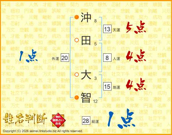 沖(8画)田(5画) 大(3画)智(12画)
