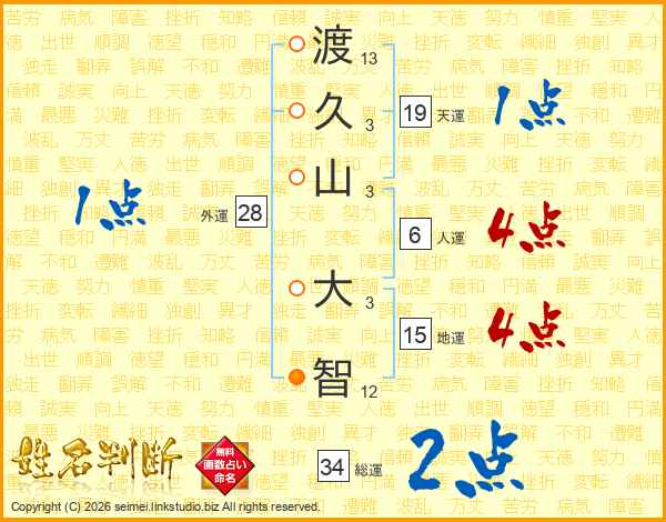 渡(13画)久(3画)山(3画) 大(3画)智(12画)