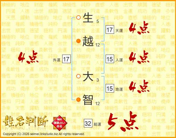 生(5画)越(12画) 大(3画)智(12画)