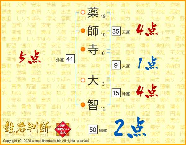 薬(19画)師(10画)寺(6画) 大(3画)智(12画)