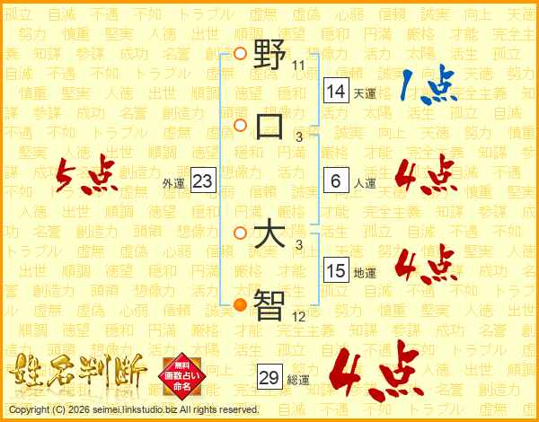 野口大智さんの総運は29画の4点!