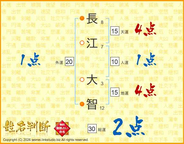 あなたの人生を表す1番重要な運勢です。生涯を通じて影響する総合運となり、主に50歳以降の晩年期に影響を及ぼします。苗字と名前の合計画数。